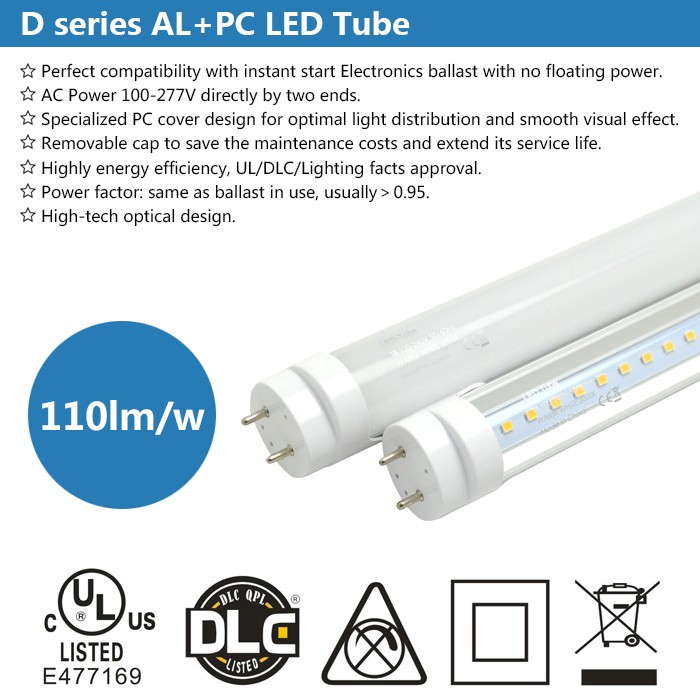 Description of UL DLC AL+PC T8 led tube 110lm/w plug and play